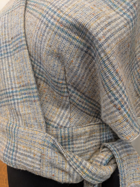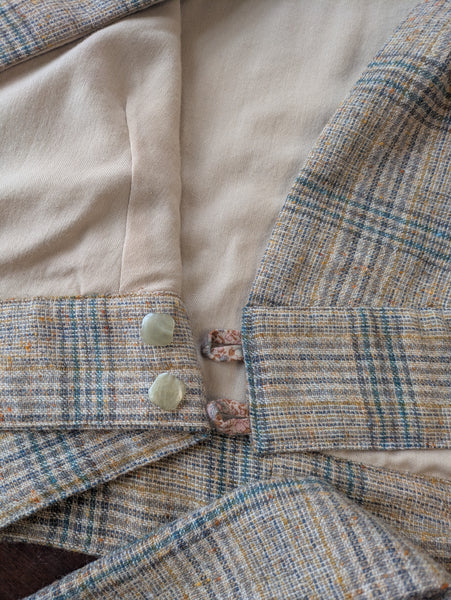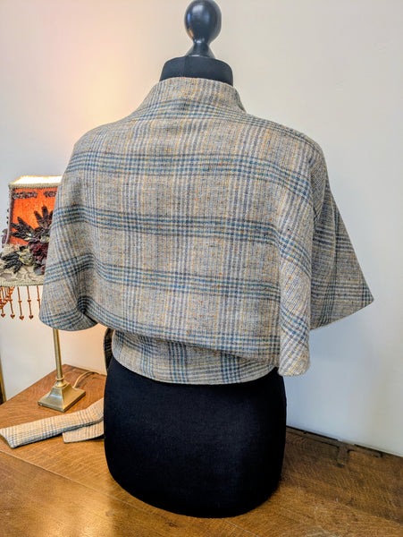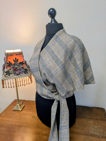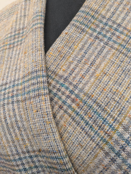 A lighter weight wool shawl of vintage large check with beige,dark green, teal and mustard, lined with an oatmeal Vintage Viyella lightweight wool.